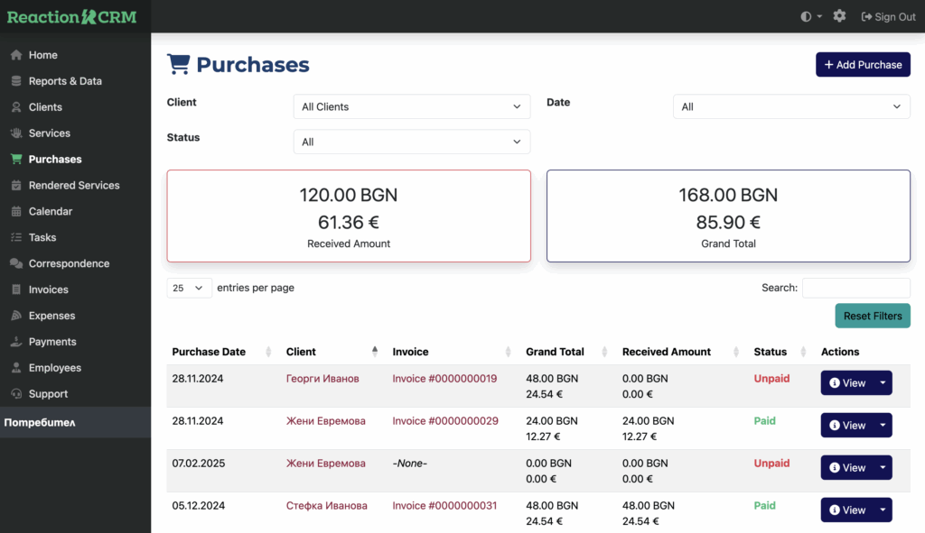 Simple purchases can be entered into the system, and payment links can be created for clients to pay online. Invoices can optionally be created when a client requires them.