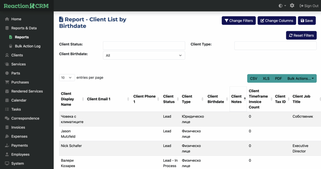 Any report can be exported to a CSV, Excel, or PDF with just one click. Additionally, while viewing a report, bulk actions allow you to quickly and easily add interactions, tasks, letters, tags and more to each of the results returned in the report.